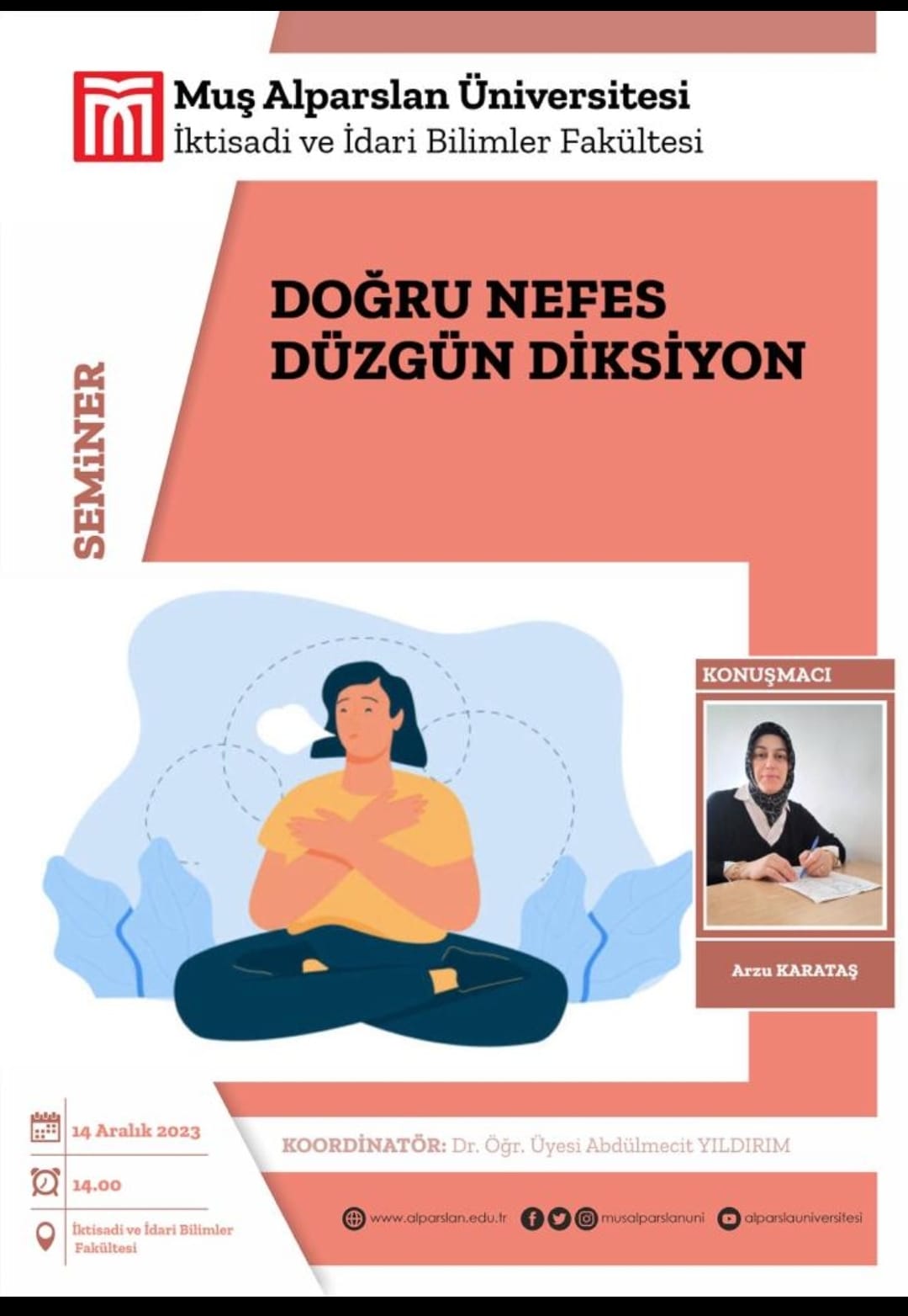 İktisadi ve İdari Bilimler Fakültesi bünyesinde Dr. Öğr. Üyesi Abdulmecit YILDIRIM koordinatörlüğünde 14 Aralık 2023 tarihi saat 14.00'te İşletme Yüksek Lisans öğrencisi Arzu KARATAŞ tarafından ‘Doğru Nefes Düzgün Diksiyon’’ adlı seminer gerçekleştirildi. Seminere İktisadi ve İdari Bilimler Fakültesi Dekanı Prof. Dr. Ömer Faruk ALTUNÇ, Fakülte hocaları ve idari personel katıldı. Seminerde, Retorik sanatının incelikleri uygulamalar eşliğinde katılımcılara aktarıldı. Ayrıca Diyafram nefesi gibi doğru nefes alım teknikleri katılımcılara gösterilerek, doğru nefes almanın yararları üzerinde duruldu. Seminer, İktisadi ve İdari Bilimler Fakültesi Dekanı Prof. Dr. Ömer Faruk ALTUNÇ'un, Konuşmacı Arzu KARATAŞ'a teşekkür belgesini takdim etmesi ile sona erdi.