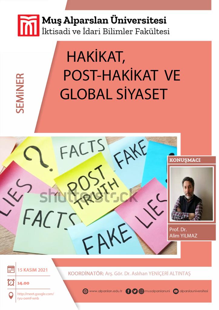 Muş Alparslan Üniversitesi İktisadi ve İdari Bilimler Fakültesi tarafından 15-11-2021 tarihlerinde Hakikat, Post-hakikat ve Global Siyaset semineri düzenlendi. Seminerde Prof. Dr. Alim Yılmaz, hakikat sonrası ve güncel siyasi olayları ele aldı. Ardından, sosyal medyanın nasıl kitleleri etkileme ve medya aracı haline geldiğini anlattı. Son olarak Prof. Dr. Yılmaz, post-hakikat, popülizm ve propaganda arasındaki ilişkiye ve bunların birbirleri üzerindeki etkisine değindi.