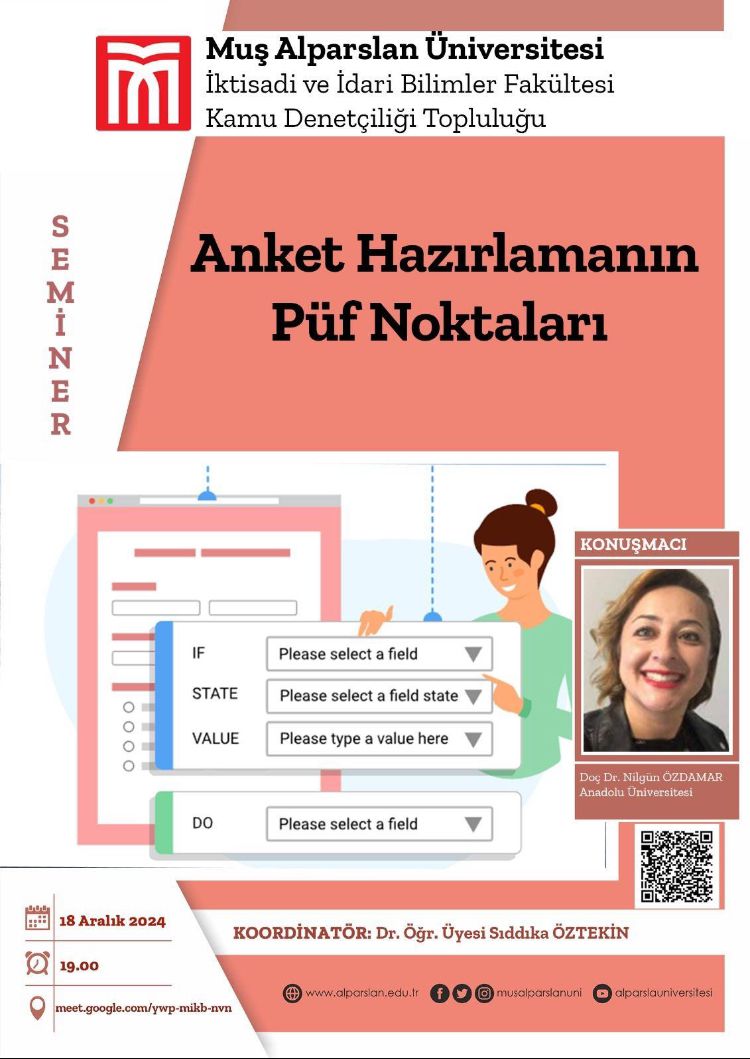 Muş Alparslan Üniversitesi İktisadi ve İdari Bilimler Fakültesi olarak düzenlenen Kasım ayı içinde başlanan Aralık ve Ocak ayında da devamı planlanan bilimsel araştırma yöntemleri serisinin dördüncüsü “Anket Hazırlamanın Püf Noktaları” adlı seminer, Anadolu Üniversitesi Açıköğretim Fakültesi Bilgisayar ve Öğretim Teknolojisi Eğitimi Bölümünden Sayın Doç. Dr. Nilgün Özdamar tarafından verildi. Alanında uzman olan Özdamar, düzenlenen seminerde anket hazırlamanın püf noktalarından bahsetti.