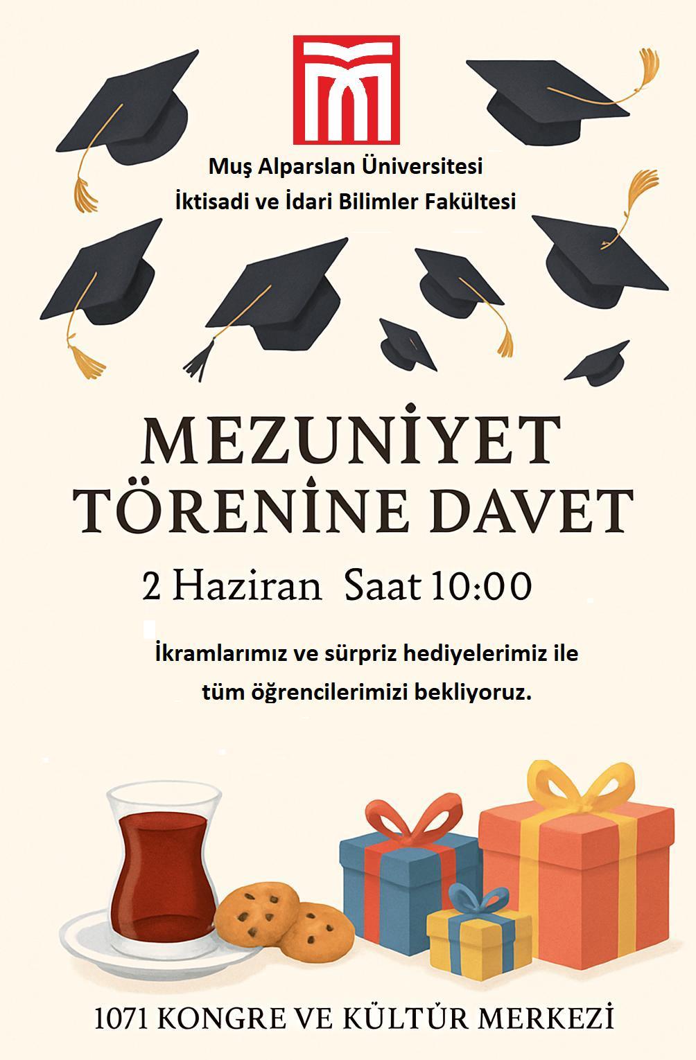 Muş Alparslan Üniversitesi İktisadi ve İdari Bilimler Fakültesi, 2024-2025 akademik yılı mezuniyet töreniyle öğrencilerini büyük bir gururla uğurlamaya hazırlanıyor. 2 Haziran 2025 Pazartesi günü gerçekleşecek olan tören, Fakültemizin Siyaset Bilimi ve Kamu Yönetimi, İşletme ile Uluslararası Ticaret ve İşletmecilik bölümlerinden mezun olan öğrencilerimizi yeni yaşamlarına uğurlarken, aynı zamanda fakültemiz için tarihi bir dönüm noktasını da simgeliyor.